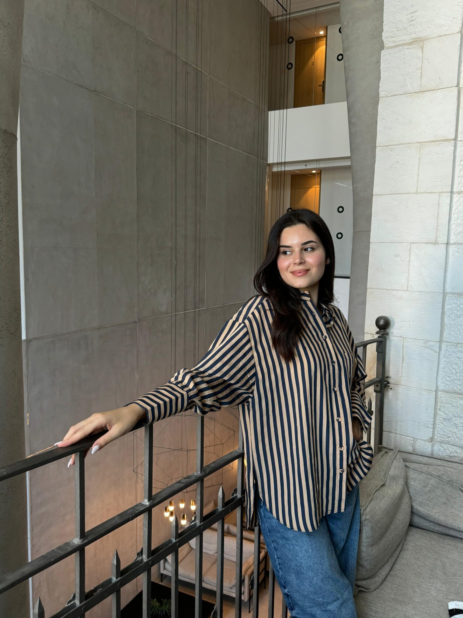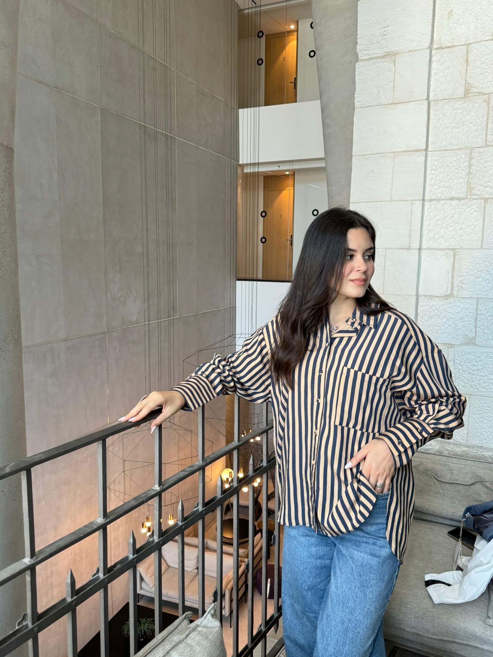 חולצת אוברסייז מכופתרת בדוגמת פסים אנכיים בגווני שחור ובז' – שילוב מדויק בין קלאסי למודרני. הגזרה הרפויה מעניקה מראה נונשלנטי, עם כיס קדמי ושיק בלתי מתאמץ שמתאים גם ליום וגם לערב.