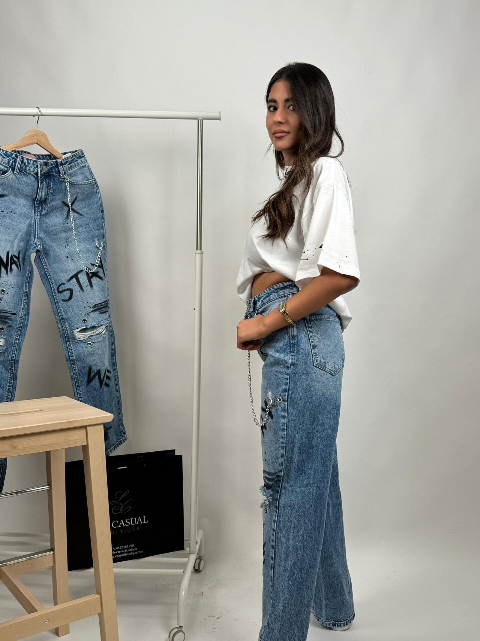 טי-שירט לבנה אוברסייז עם הדפס טקסט בצווארון וקרעים עדינים בשרוולים – בסיס מושלם לשילוב עם לוק אורבני, קליל ושיקי.