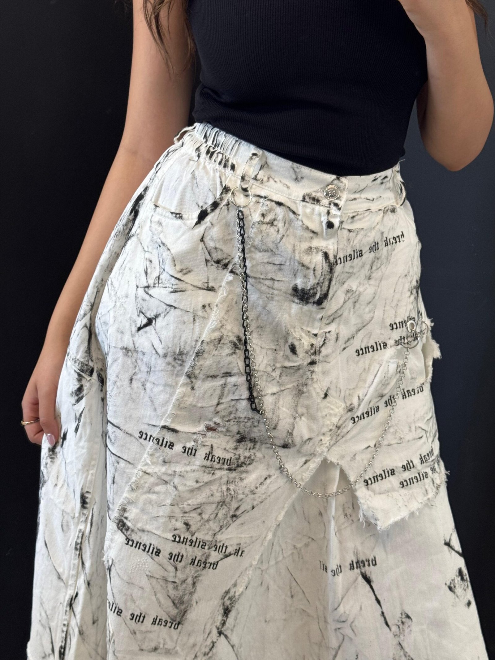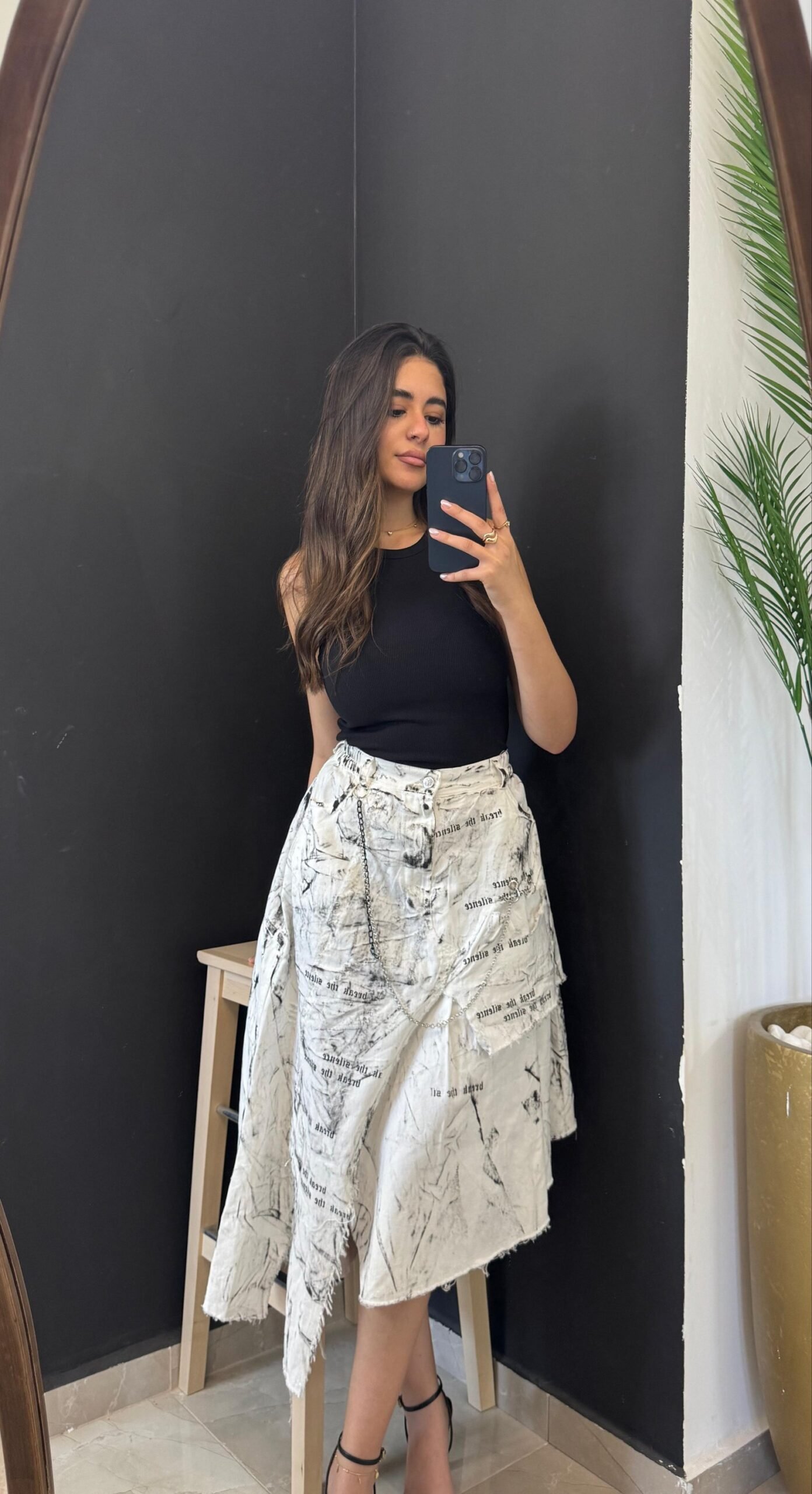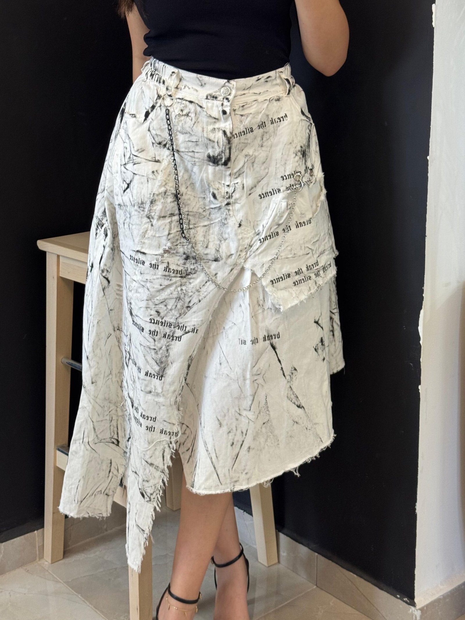 חצאית אסימטרית בגוון לבן עם הדפסים אומנותיים, קצוות פרומים ושרשרת כסופה. פריט מלא נוכחות שמשלב טקסטורה, תעוזה ואופנה אורבנית – מושלם למי שאוהבת סטייל עם אופי.