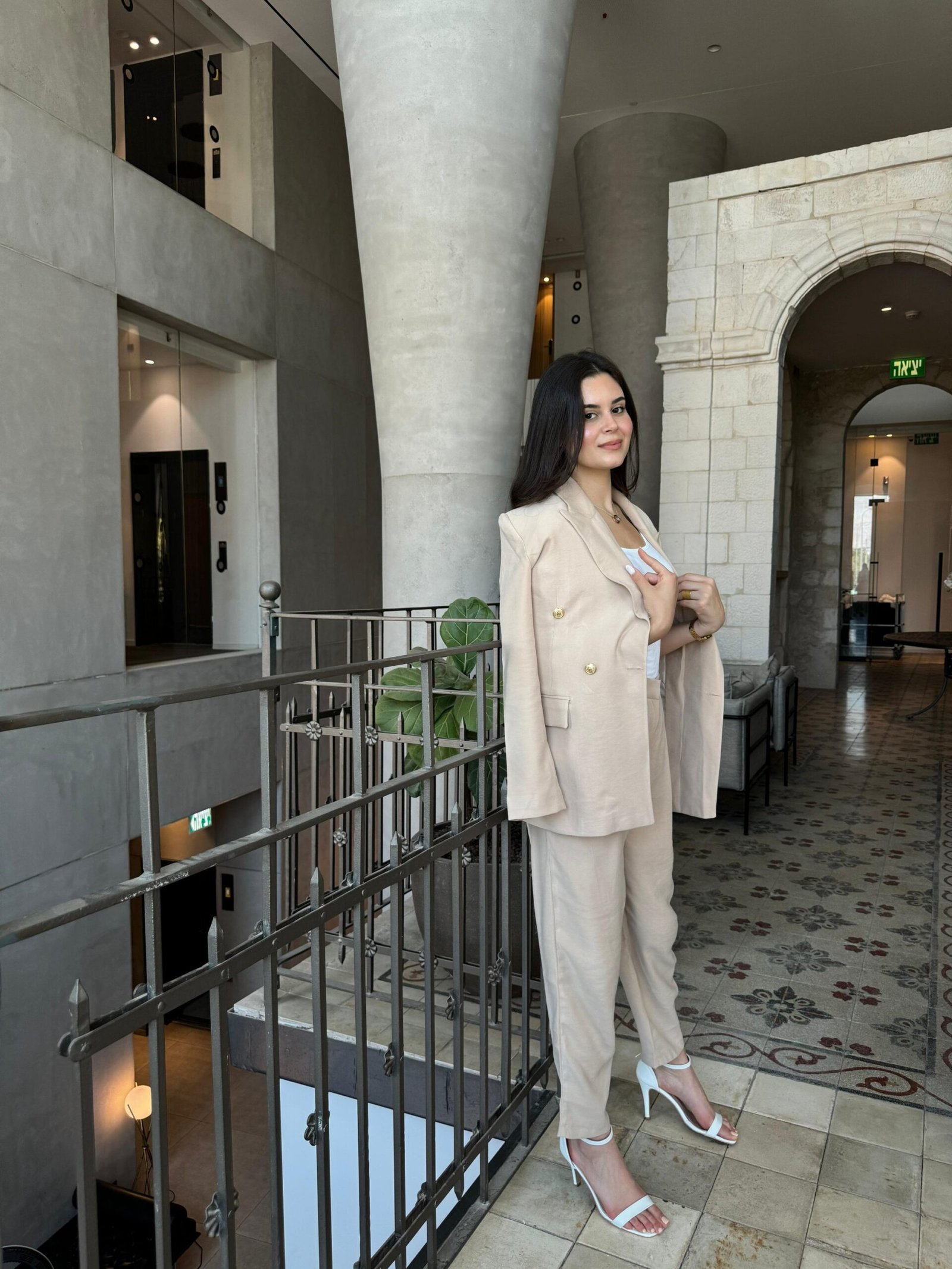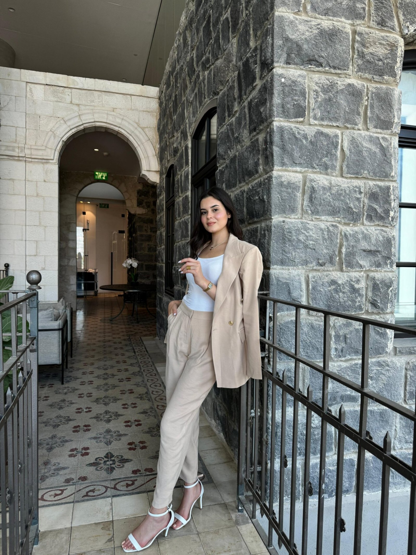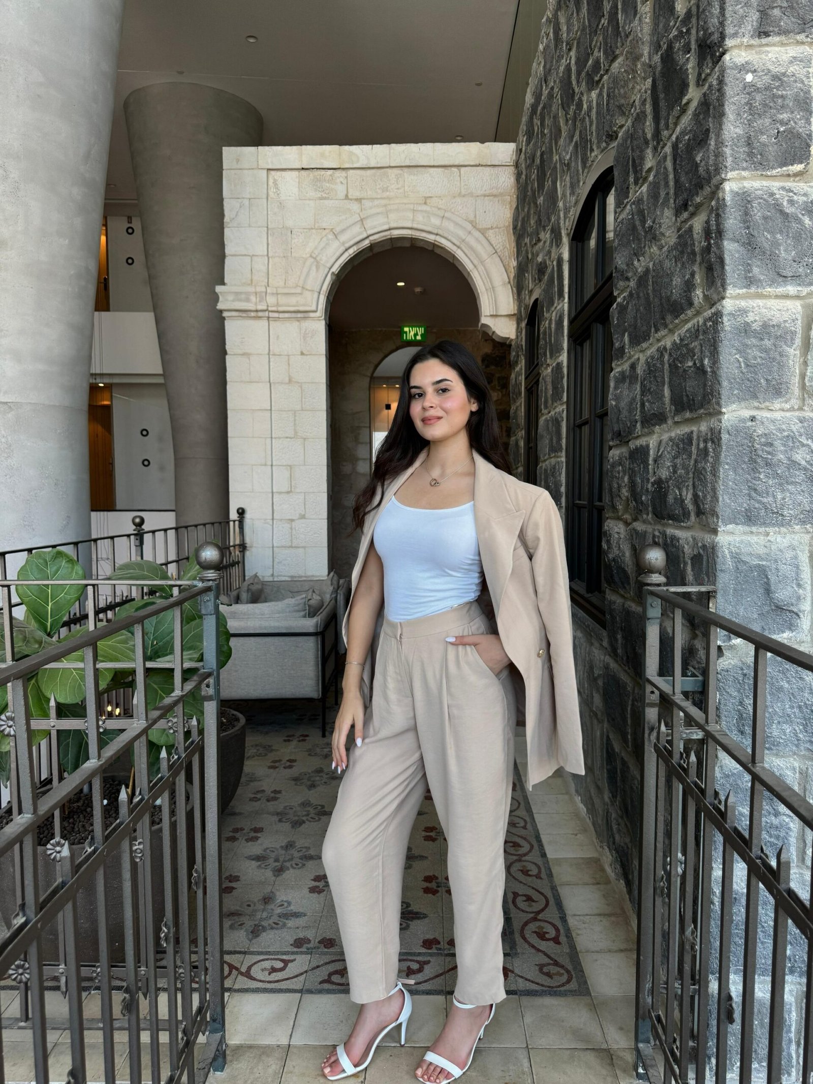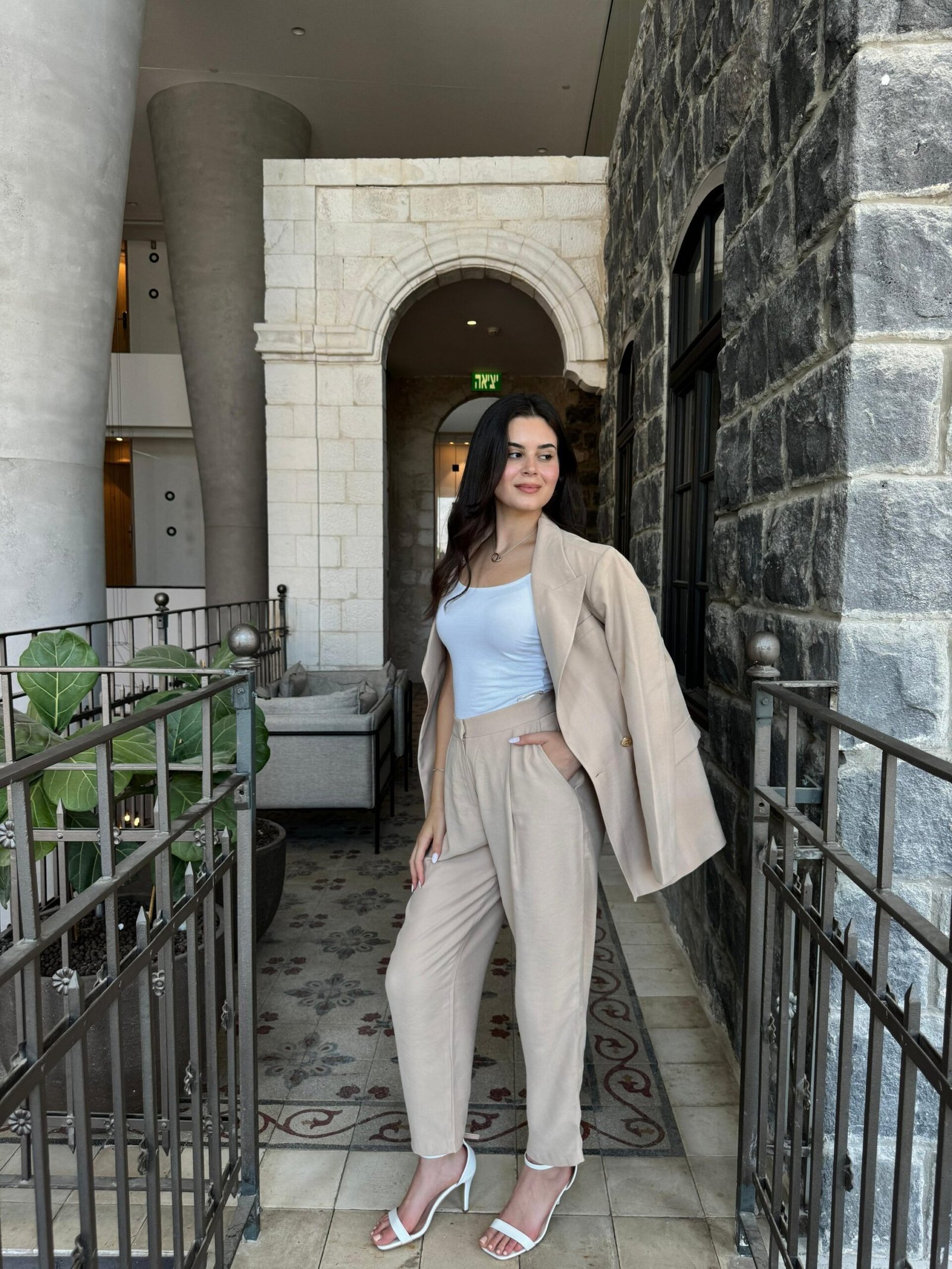 סט קלאסי בגוון בז' הכולל בלייזר קליל, מכנסיים מחויטים , שילוב בין אלגנטיות לנוחות – מושלם ליום במשרד, פגישה עסקית או כל רגע שבו את רוצה לשדר נוכחות שקטה אבל ברורה.