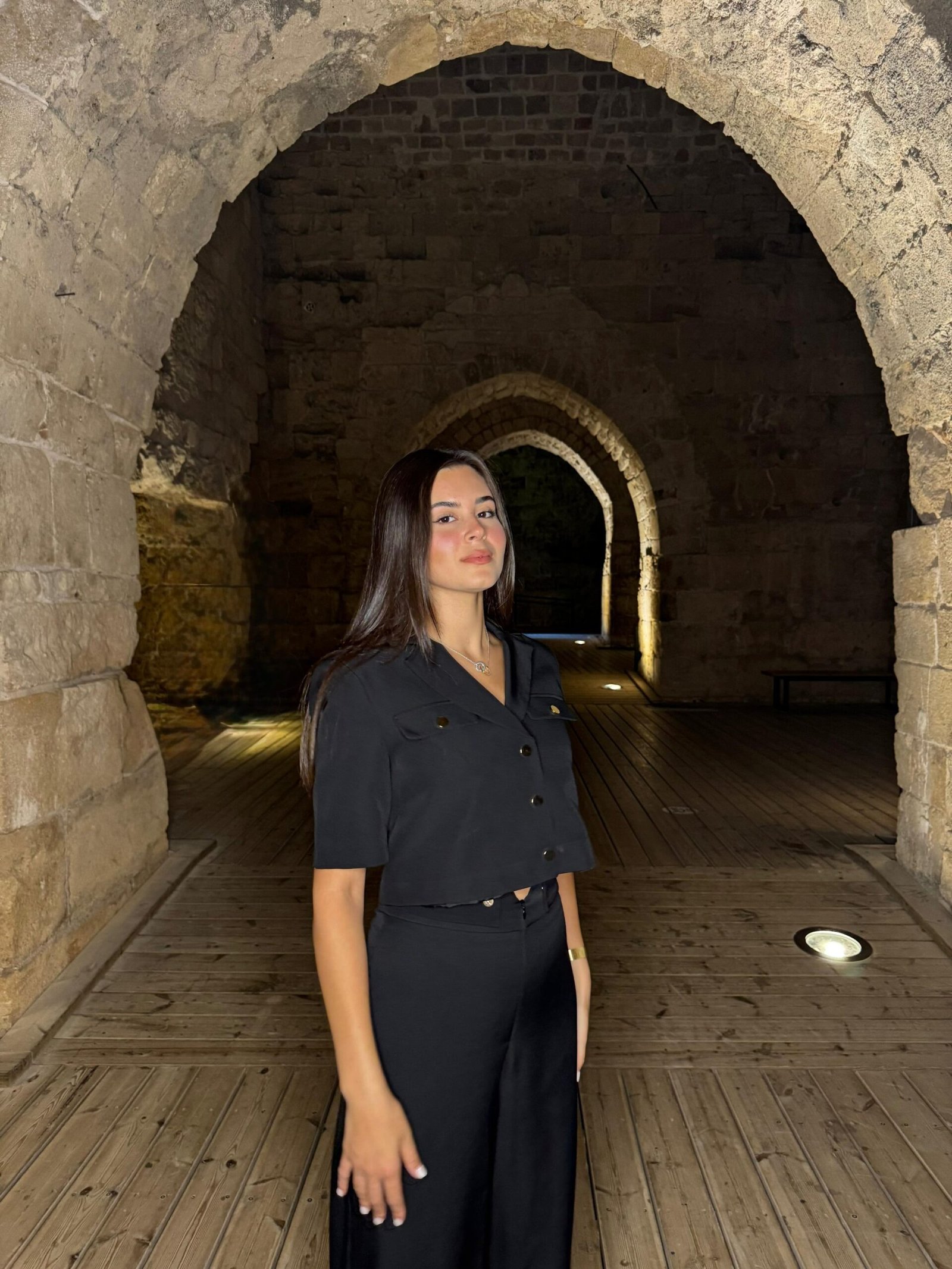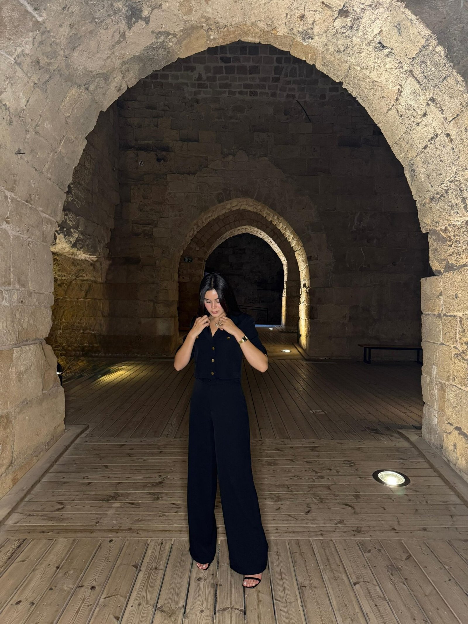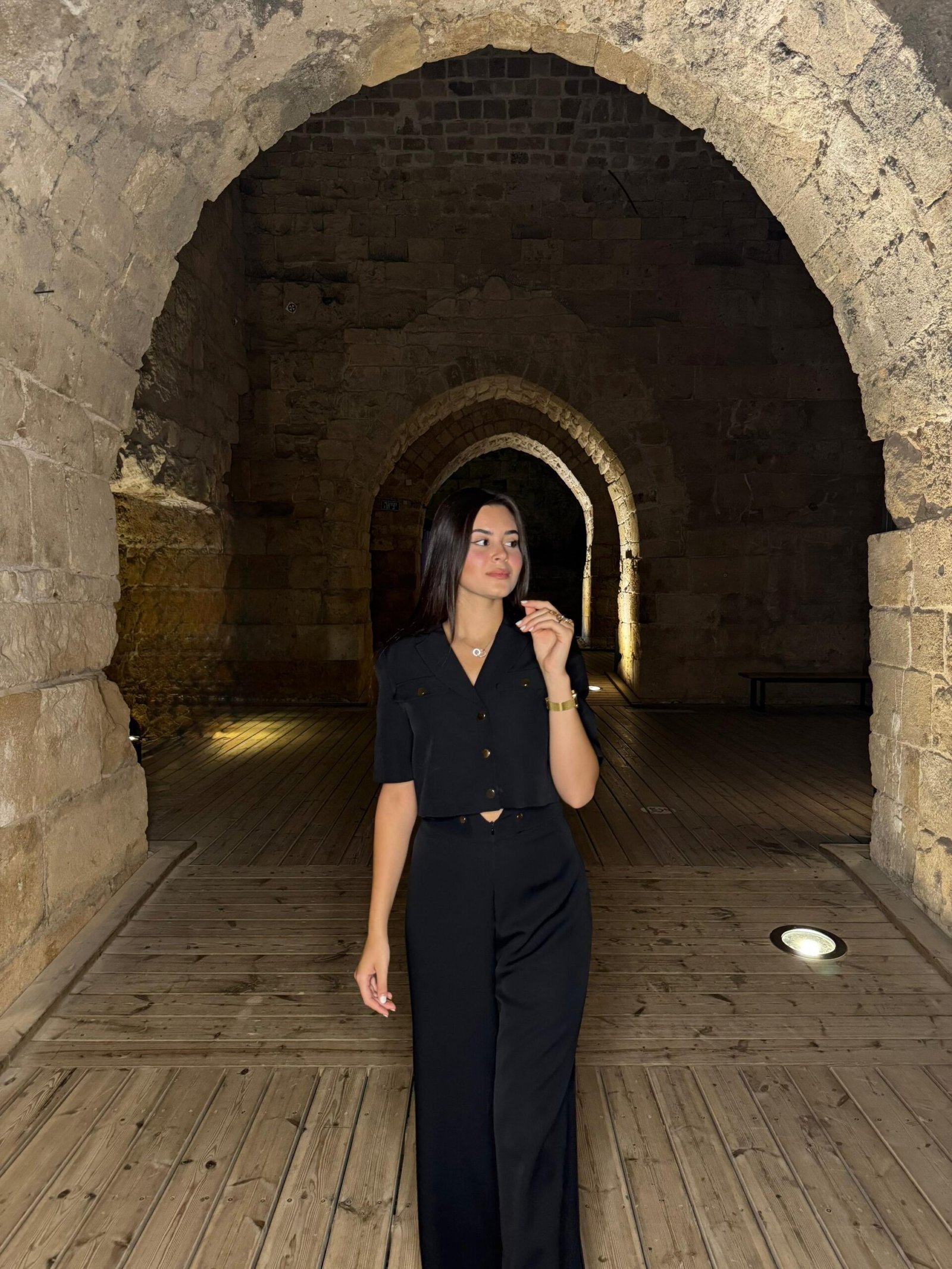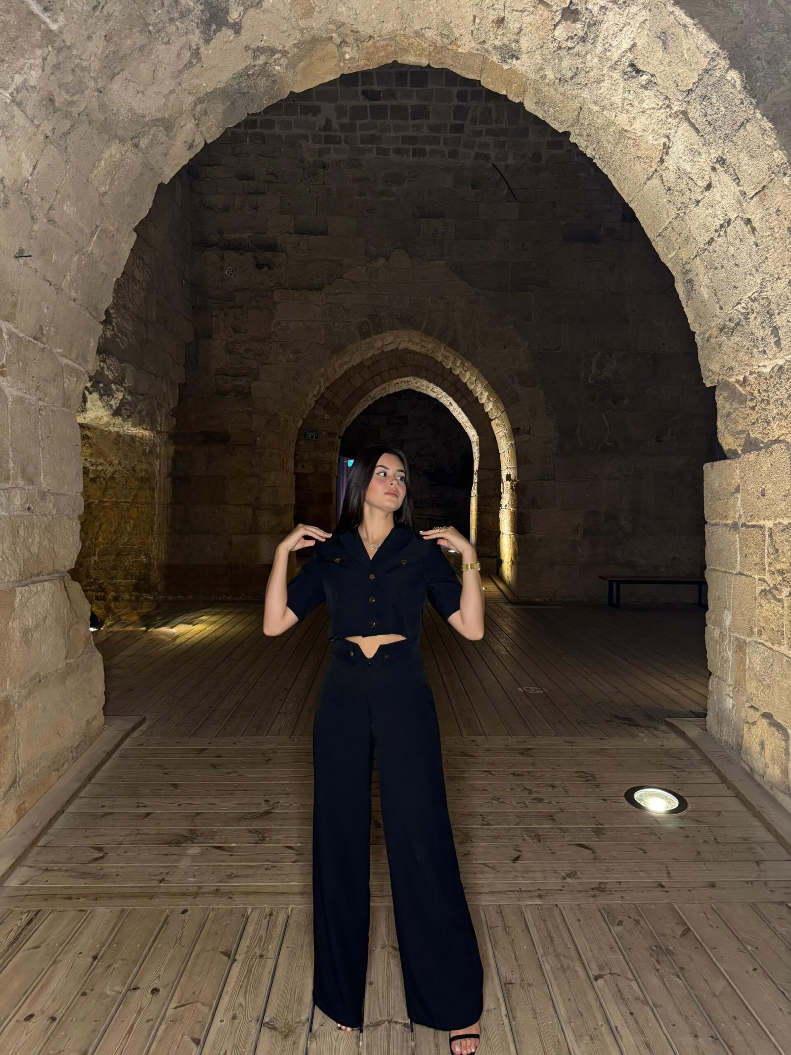 סט שחור קלאסי שמשלב עוצמה עם נגיעות של תחכום. חולצה קצרת שרוול בגזרה מחויטת עם כפתורים וגימור נקי, בשילוב מכנסיים רחבים בגזרה גבוהה שיוצרים סילואט ארוך ומתוחכם. מראה ערב אלגנטי שמתאים לכל מקום – מאירוע קייצי ועד ליציאה יוקרתית בעיר. הבחירה המושלמת למי שאוהבת לשדר שיק בטוח ונוכחות בלתי מתפשרת.