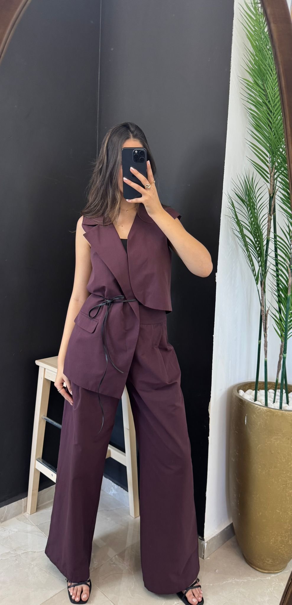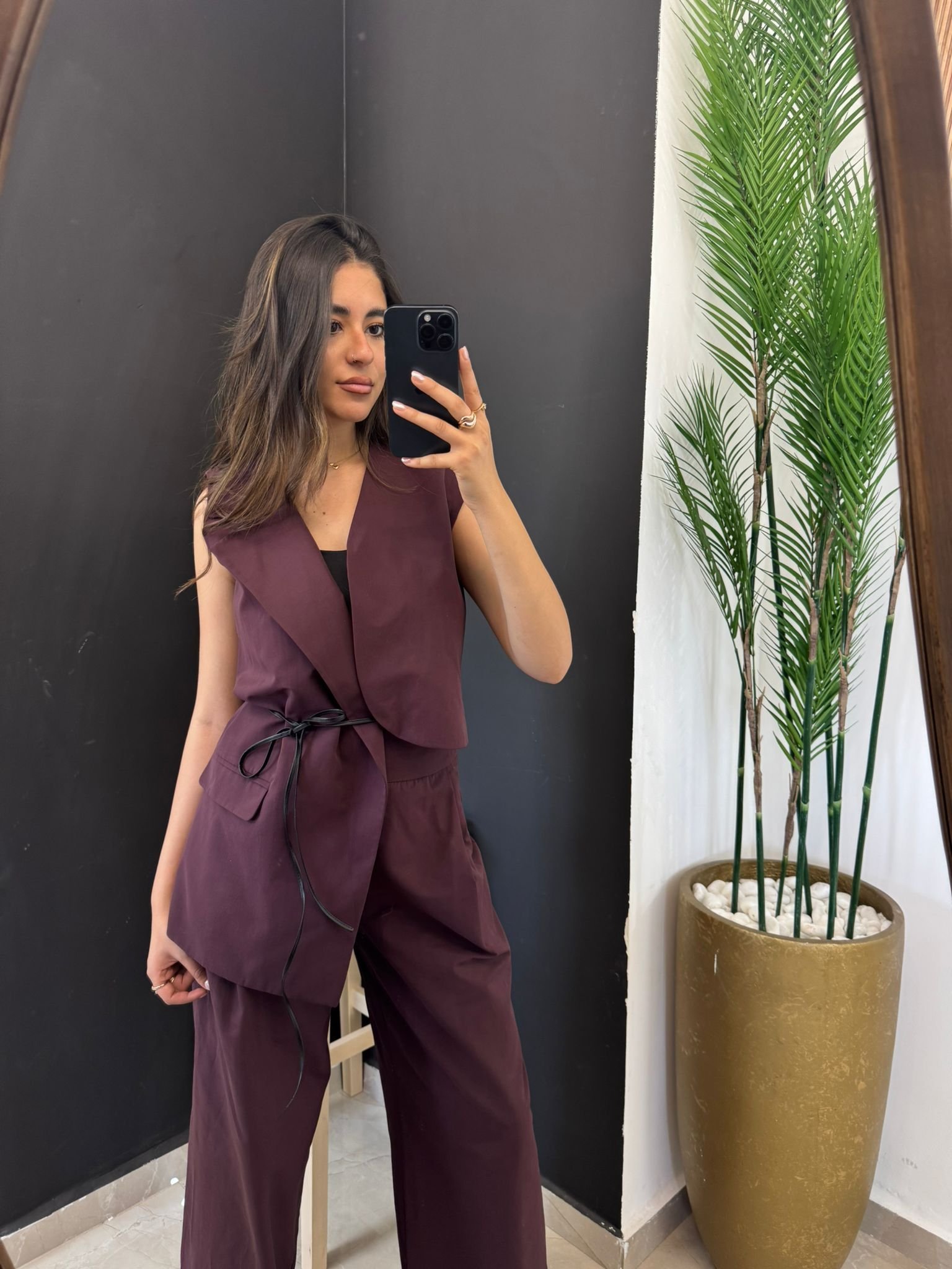 סט בגוון בורדו עמוק עם וסט מחויט וסגירת קשירה צדדית, יחד עם מכנסיים רחבים בגזרה גבוהה. שילוב של עוצמה ורוך בגוון מרשים – הבחירה המושלמת לנשים שמבינות סטייל.