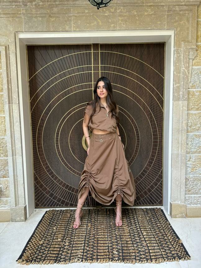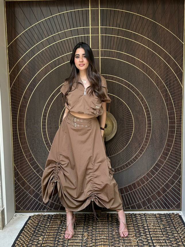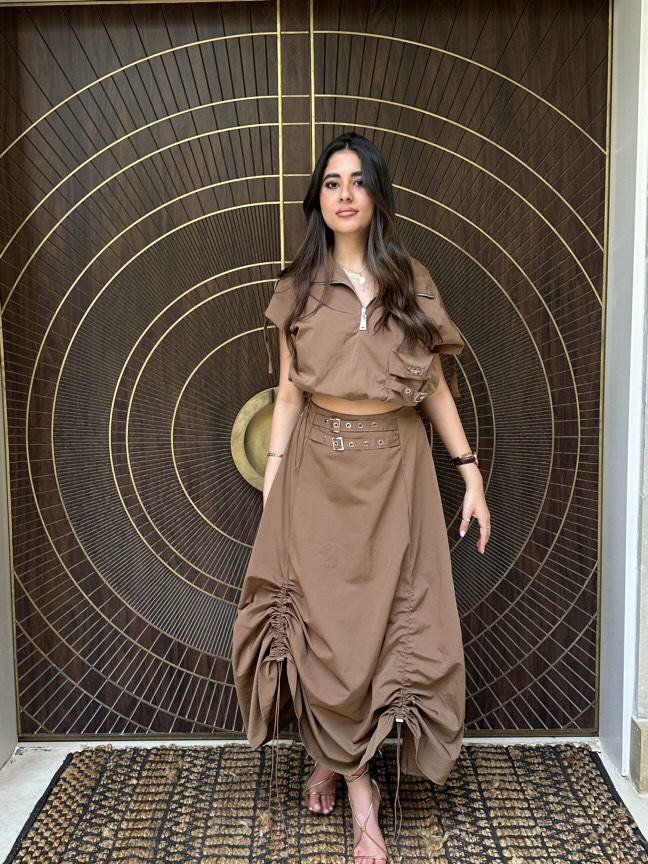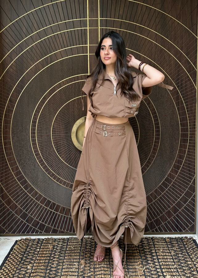 סט חום ייחודי שמשלב טופ עם רוכסן וחצאית עם שרוכים וכיסים מדורגים – מושלם למראה ייחודי ומעודן עם טאץ' אורבני ונוחות בלתי מתפשרת.