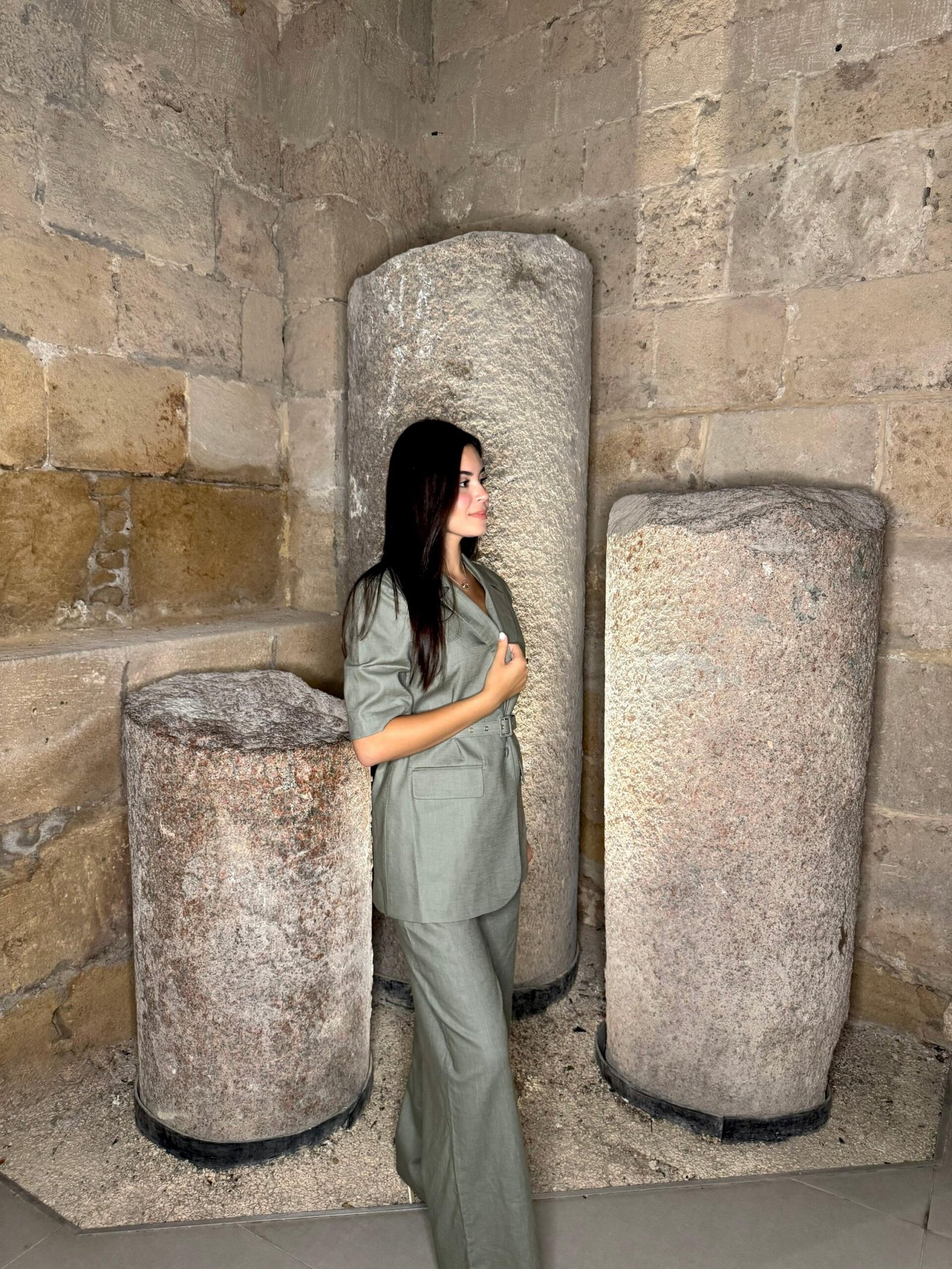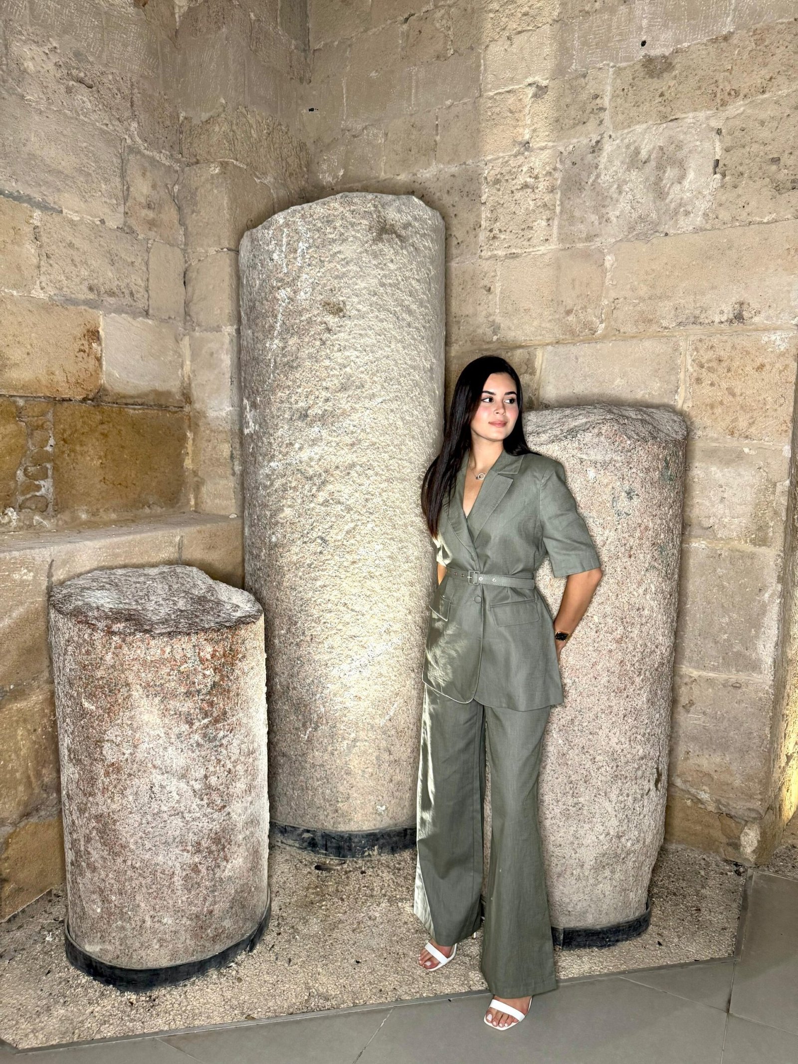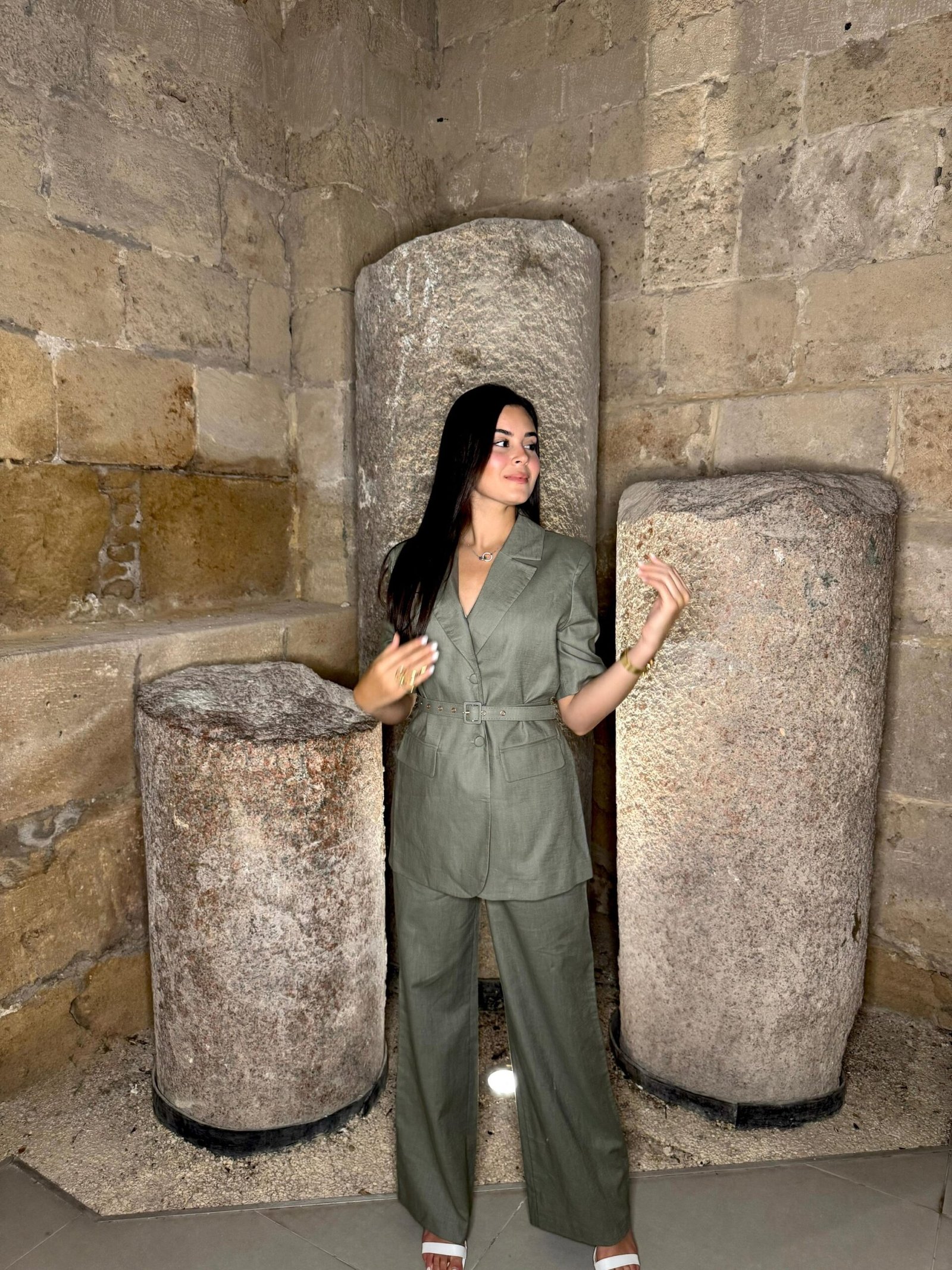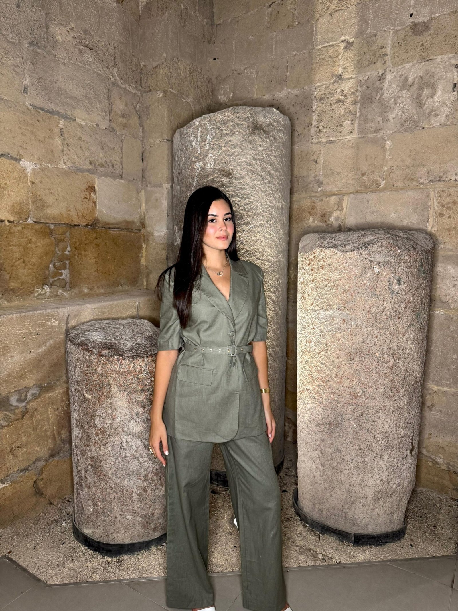 חליפה דו-חלקית בגוון ירוק זית עמוק, עם גזרה מחויטת אך נינוחה. הבלייזר מגיע עם שרוול קצר וחגורה מחמיאה שמדגישה את המותן ומוסיפה טאץ' נשי למראה מחוספס. המכנס בגזרה ישרה ומשוחררת שמשלימה את המראה לעוצמה שקטה, מודרנית ואלגנטית. מושלם לקיץ הישראלי עם טוויסט של נוכחות.