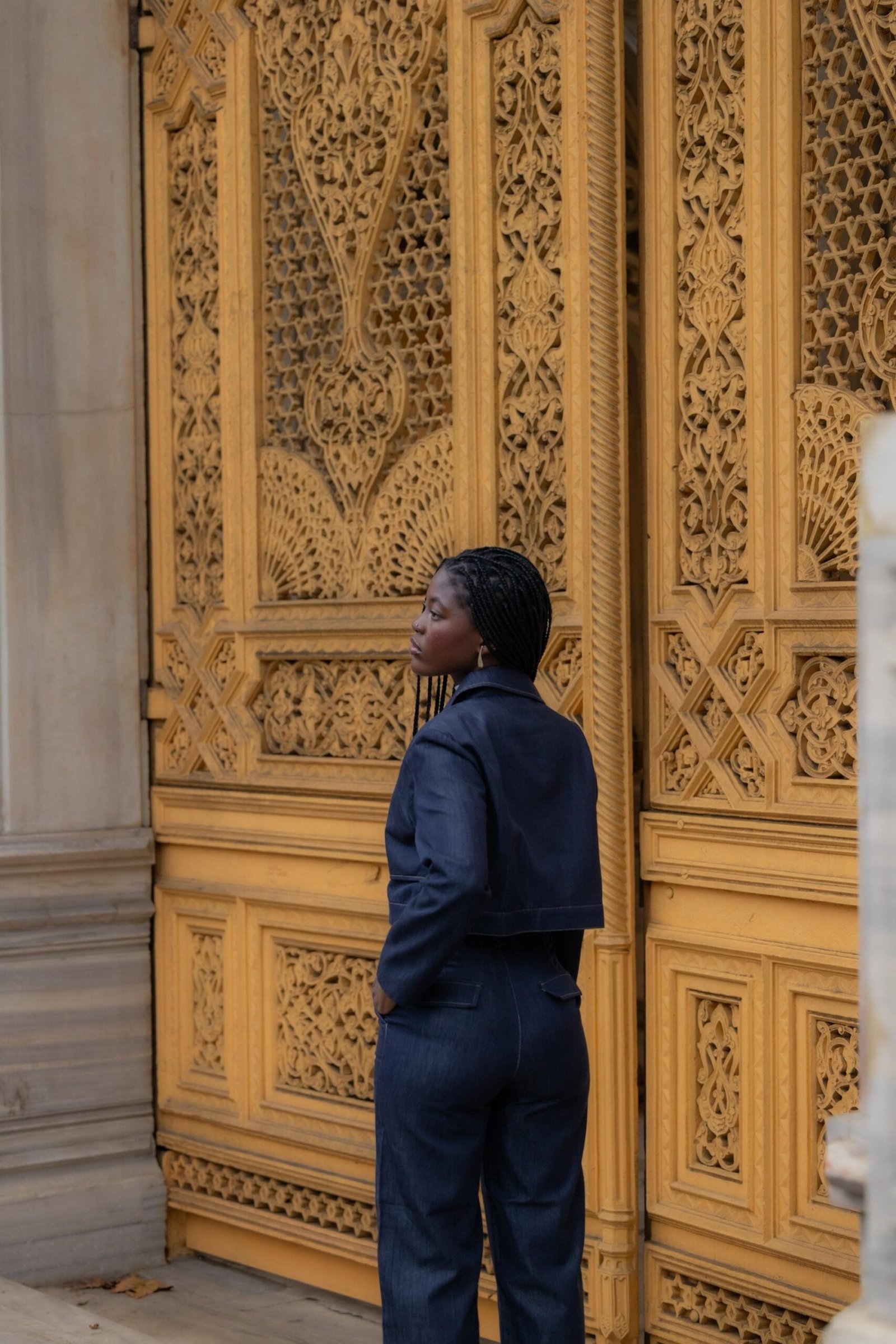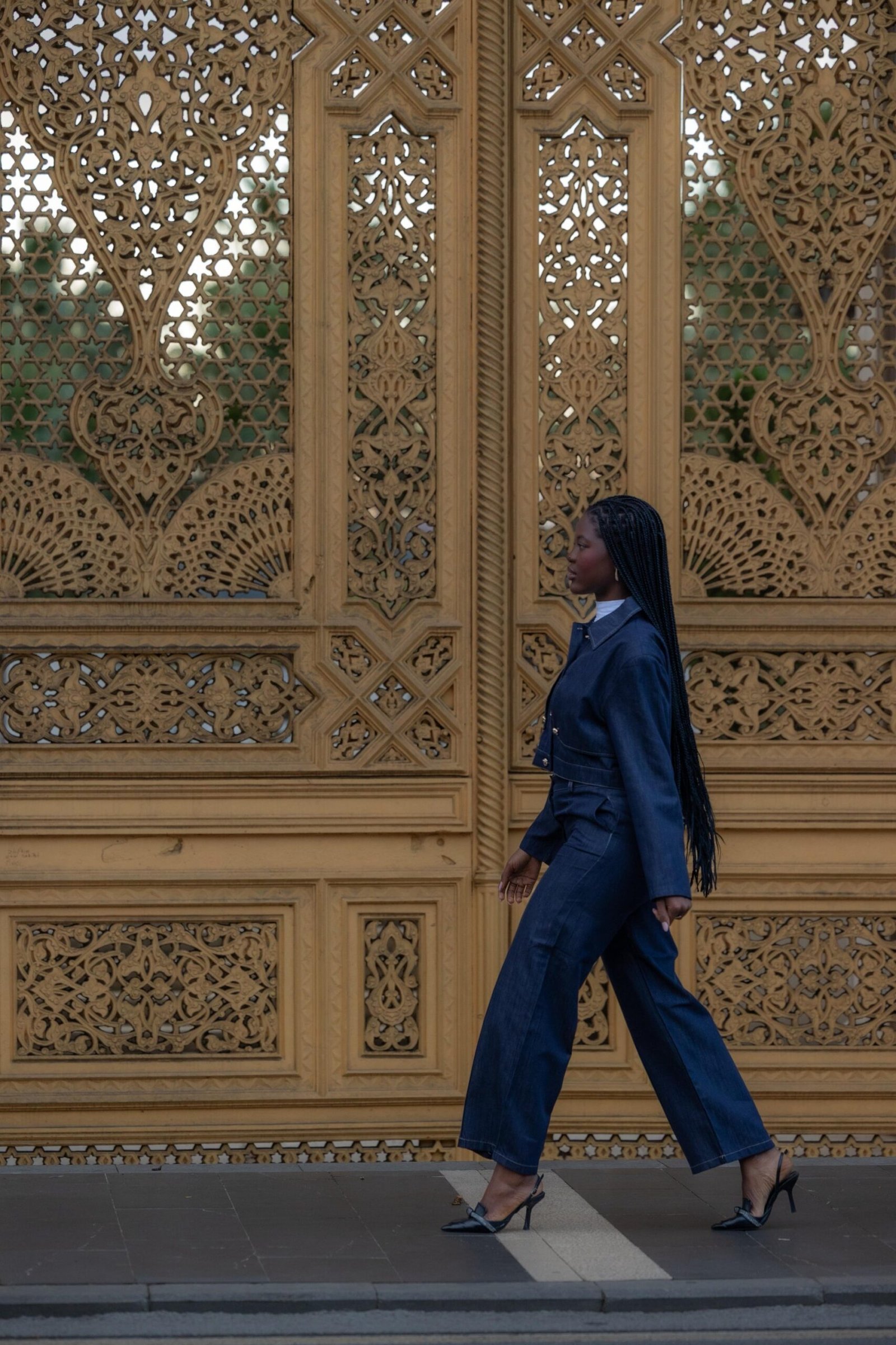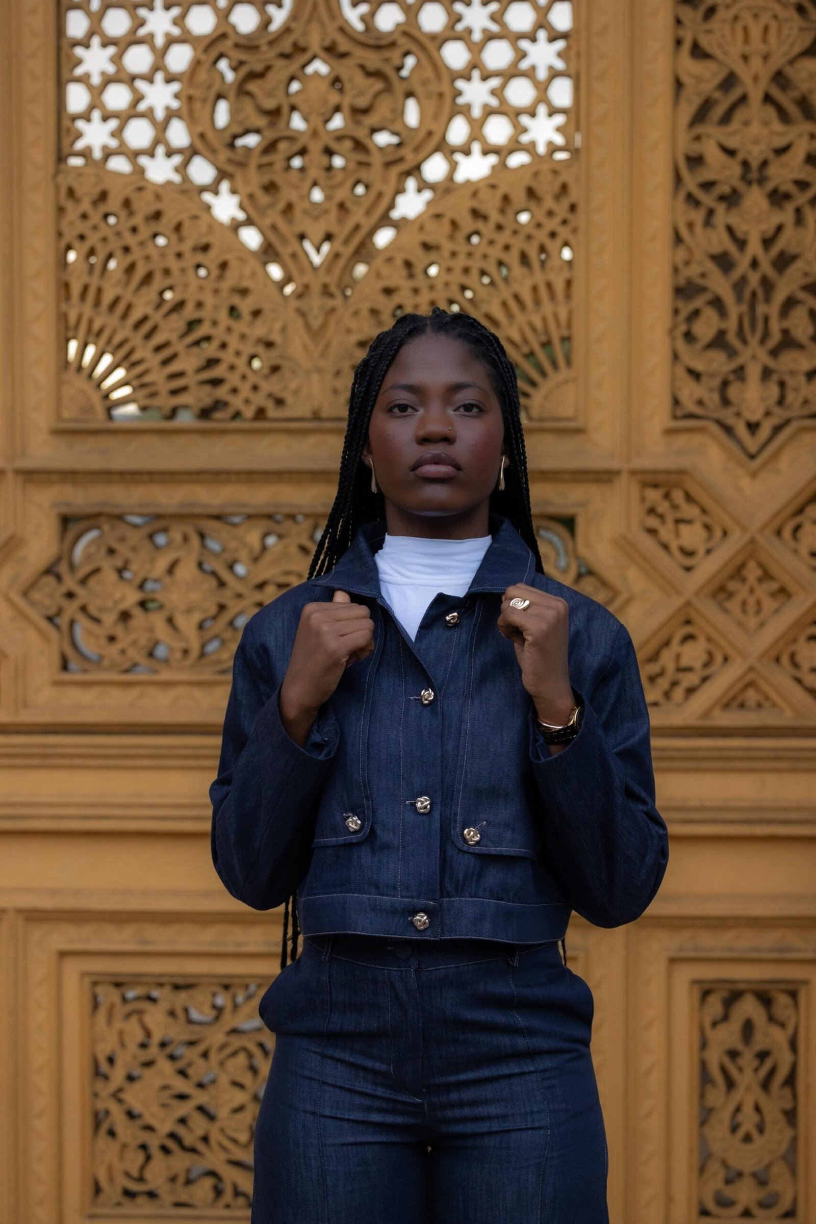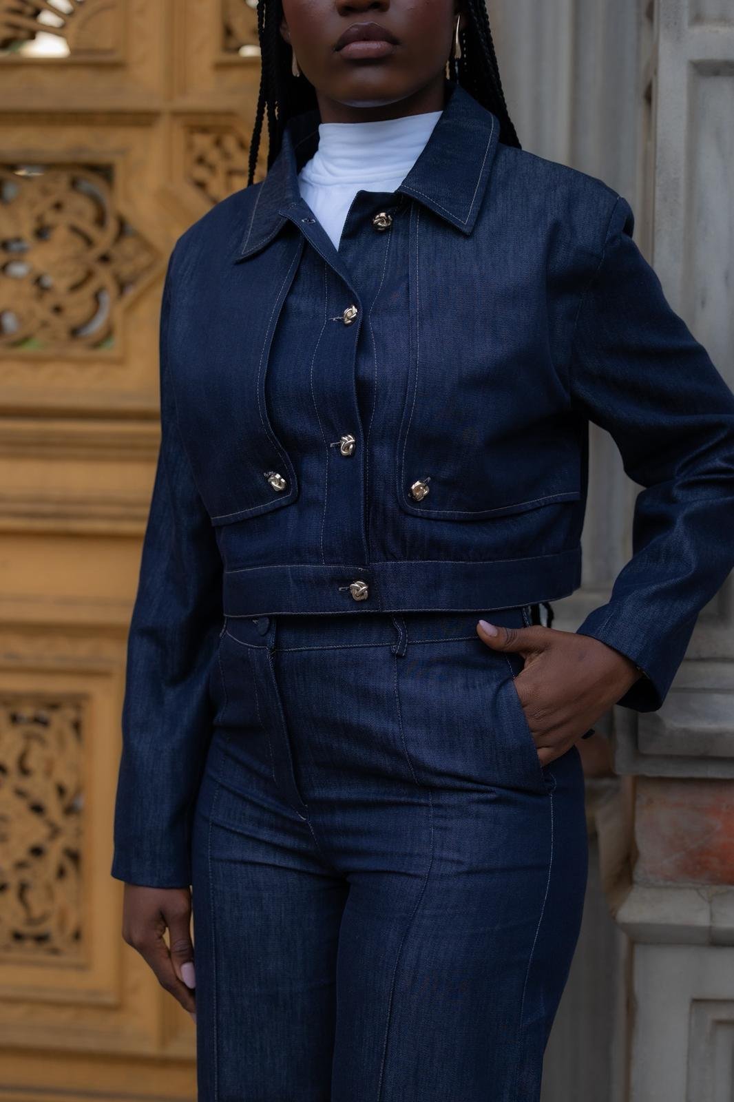 סט ג'ינס יוקרתי בגוון כחול עמוק, עם גימורים מדויקים וכפתורים זהובים שמוסיפים נגיעה של אלגנטיות. הג'קט הקצרוני מחמיא למותן והגזרה המחויטת יוצרת מראה נשי, חזק ונקי – בדיוק כמו שאת אוהבת.