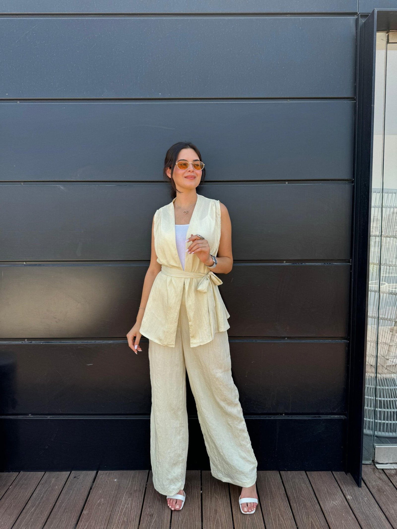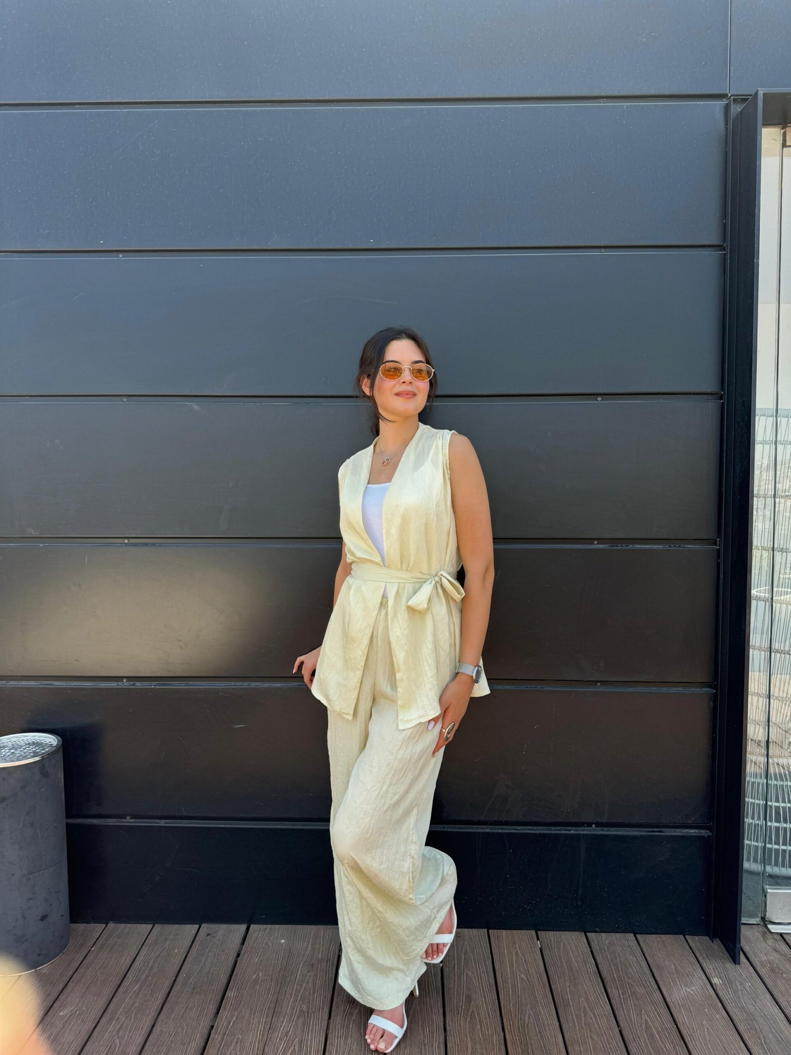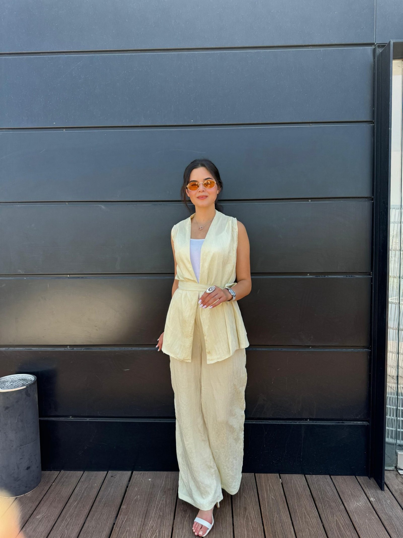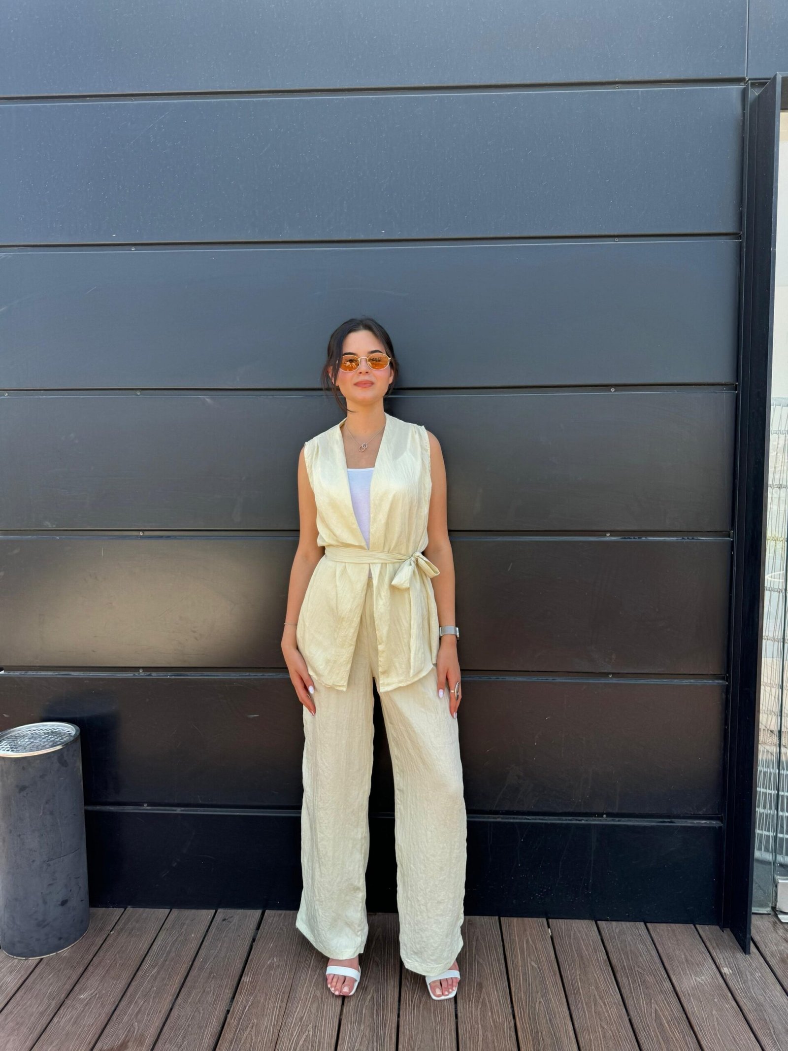 סט קייצי בגוון צהוב בהיר וזוהר, עם טופ מחויט קשור בצד ומכנסיים רחבים בגזרה נינוחה. לוק שמשלב אור, רוך וסטייל – מושלם לבוקר שמשי, יציאה קז'ואלית או אירוע קליל עם נוכחות
